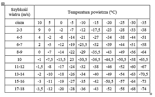 Zależność odczuwania zimna od siły wiatru