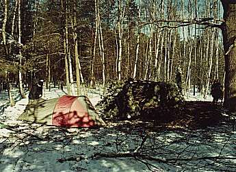 Biwakowałem w KOMANDOSIE w końcu lutego w Puszczy Augustowskiej - spałem w pojedynkę, ubrany grubo, w dwóch cienkich śpiworach letnich. Nie zmarzłem. Ponieważ po bokach komory mieszkalnej, nisko przy ziemi, znajdują się wywietrzniki, obłożyłem gałęziami świerku bok namiotu wystawiony na zimny wiatr.